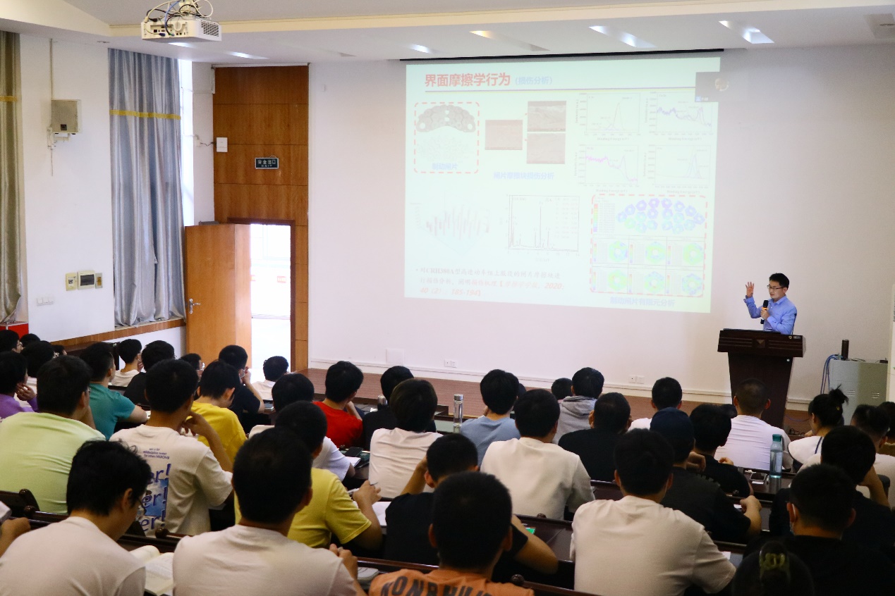 项老师从课题的研究背景、制动界面摩擦学行为及调控、基础理论研究的工程化应用等四个方面展开讲授,深入浅出地阐述了高铁基础制动部分存在的界摩擦行为研究现状,重点强调了摩擦学行为调控及一些工程问题的解决方案,为师生呈现了一场精彩的学术报告。提问环节,同学们踊跃发言,针对同学们提出的论文选题的切入点、不同条件高铁制动闸片的选择等问题,项载毓逐一进行了详细的解答。