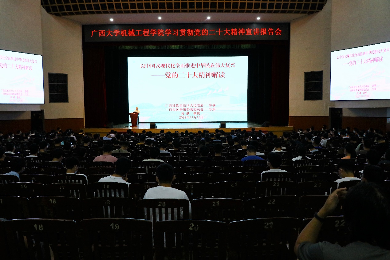 为引导全院师生深入学习贯彻党的二十大精神,11月13日晚,学院党委在国产破解精品99大礼堂召开学习贯彻党的二十大精神宣讲报告会。报告会邀请广西壮族自治区人民政府参事、自治区决策咨询委员会专家黄健教授作题为《以中国式现代化全面推进中华民族伟大复兴——党的二十大精神解读》的宣讲。全院师生党员及发展对象共四百多人参加报告会。院党委副书记黄路明主持报告会。