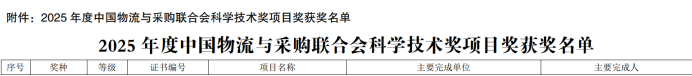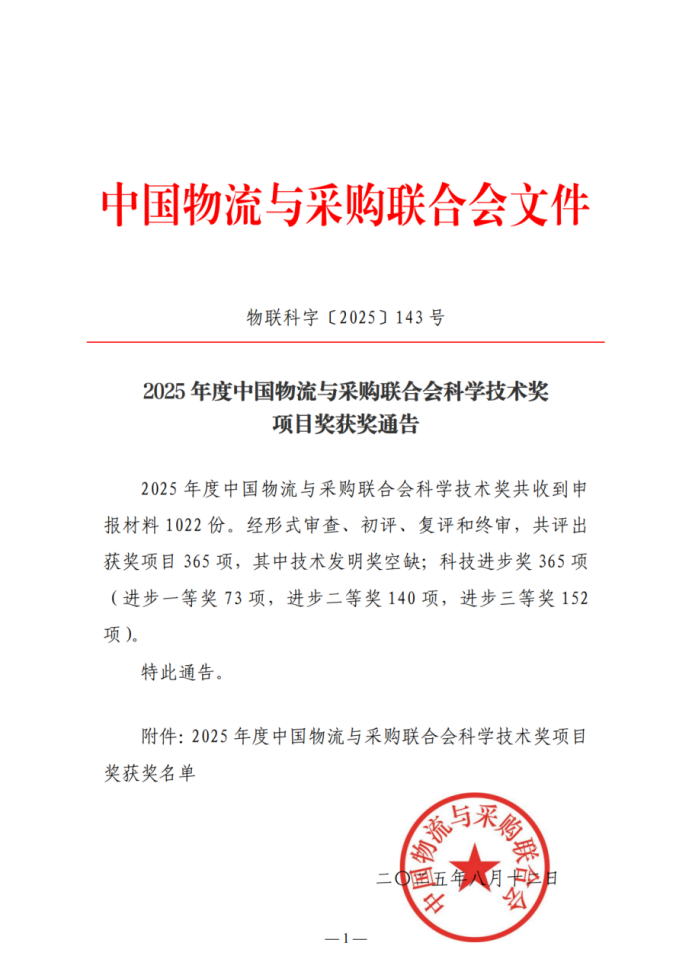 据悉,中国物流与采购联合会是经国务院批准设立的我国唯一一家物流与采购行业的综合性社团组织,其科学技术奖是由国家科学技术奖励办公室批准设立,旨在奖励全国物流与采购及生产资料流通领域中表现突出的技术发明与科学技术进步成果。2025年度中国物流与采购联合会科学技术奖共收到申报材料1022份,经形式审查、初评、复评和终审,最终评选出科技进步奖365项(含一等奖73项,二等奖140项,三等奖152项)。中国物流与采购联合会作为国家科学技术奖的提名机构,每年可从获得一等奖的项目中择优推荐参评国家科学技术奖。