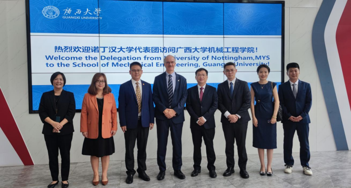 9月17日上午,英国诺丁汉大学副校长、马来西亚分校校长兼首席执行官大卫·菲茨帕特里克校长(David FitzPatrick)率马来西亚分校代表团一行五人来访我院,广西市长协会对外联络员宋益铭,校国际交流与合作处处长廖文丹、副处长郭宇路陪同参观,一同考察工程训练中心智慧车间、 广西新能源车辆动力电池与绿色动力域重点实验室以及广西制造系统与先进制造技术重点实验室。学院党委书记卢婵江、院长贺德强、君武学者龙雨、能源与动力工程系主任欧阳天成、工程训练中心主任郑炳年等接待来访,秦智鹏副教授担任翻译。