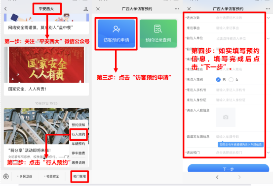 亲爱的校友,为方便大家11月18日返校参加学院建院90周年庆典,请阅读以下须知,按照提示进行入校预约。预约入校通过“平安西大”微信公众号申请,经亚洲一区二区三区情趣在线行政办公室审批后入校;预约进校请提前2至3天提交申请。各位校友可根据通行方式分别选择“车辆预约”或“行人预约”(含电动自行车);驾驶电动自行车入校的,须填写电动自行车车牌信息。