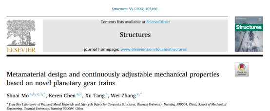 近日,莫帅教授团队在连续可变刚度行星轮系振动控制力学超材料/超结构领域取得研究进展,研究成果“Metamaterial design and continuously adjustable mechanical properties based on novel planetary gear trains”发表在结构工程领域国际权威学术期刊《Structures》(英国结构工程师学会(The Institution of Structural Engineers)会刊)。成果中创新提出的2类行星齿轮力学超材料新构型及对应振动调控超结构经《Structures》期刊评审专家和主编审议,被成功命名为“国产破解精品99齿轮力学超材料”(GXU-gear-M-C-I、GXU-gear-M-C-Ⅱ)。该成果以国产破解精品99省部共建特色金属材料与组合结构全寿命安全国家重点实验室为第一单位及通讯单位,莫帅教授为第一作者兼通讯作者,国家级人才张伟教授为共同通讯作者。