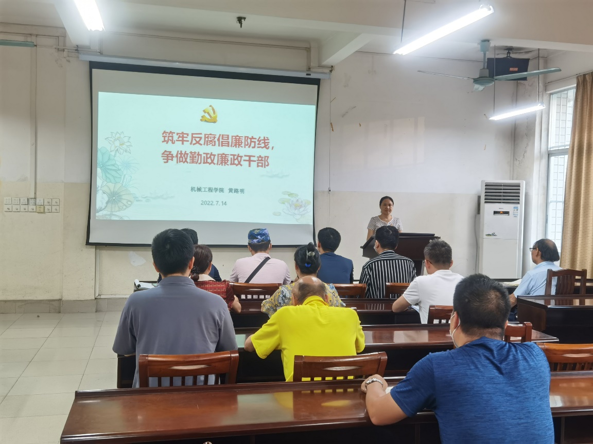 2022年7月14日下午,教工四支部在学院三楼报告厅开展党课及主题党日活动。学院党委副书记、纪委书记黄路明同志为支部全体党员上了题为“筑牢反腐倡廉防线,争做勤政廉政干部”的专题党课。